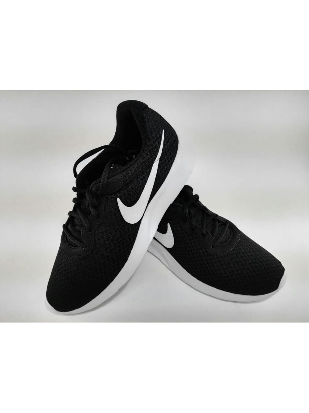 Nike. Zapatilla deportiva de rejilla color negro y símbolo nike en blanco en los laterales, suela blanca gruesa, ligero.